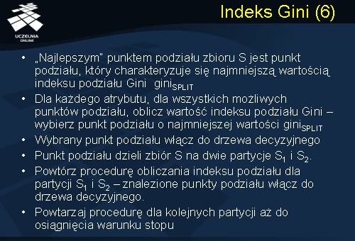 „Najlepszym” punktem podziału zbioru S, jak wspomnieliśmy wcześniej jest punkt podziału, który charakteryzuje się najmniejszą wartością indeksu podziału Gini. Wracając do prezentowanego wcześniej algorytmu SPRINT i procedury Partition, zauważmy, że kluczowym punktem tej procedury jest analiza dla każdego atrybutu wszystkich możliwych punktów podziału. Oznacza to, że dla każdego atrybutu, dla wszystkich możliwych punktów podziału, obliczamy wartość indeksu podziału Gini i wybieramy punkt podziału o najmniejszej wartości giniSPLIT . Wybrany punkt podziału włączamy do drzewa decyzyjnego jako wierzchołek wewnętrzny. Punkt podziału dzieli zbiór S na dwie partycje S1 i S2. Następnie powtarzamy procedurę obliczania indeksu podziału dla partycji S1 i S2, ponownie dla każdego atrybutu i wszystkich punktów podziału poszukujemy wartości indeksu podziału poszukujemy wartości indeksu podziału Gini. Wybieramy punkty podziału o najmniejszej wartości indeksu podziału Gini. Znalezione punkty podziału włączamy do drzewa decyzyjnego. Powtarzamy tę procedurę dla kolejnych partycji aż do osiągnięcia warunku stopu.