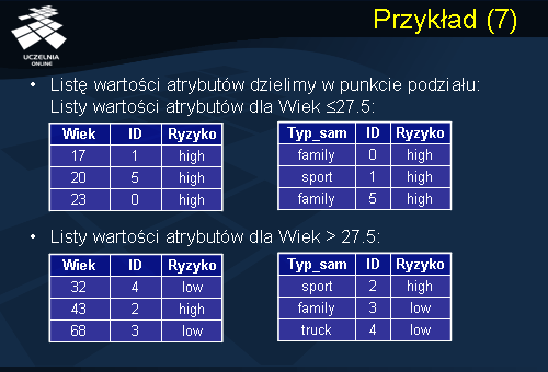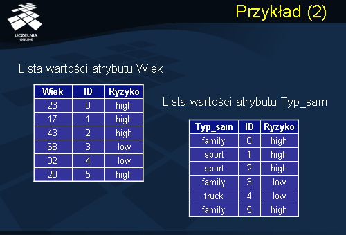 Zauważmy, że przedstawiony zbiór treningowy zawiera dwa atrybuty deskryptory oraz jeden atrybut decyzyjny Ryzyko. Deskryptory to atrybut numeryczny Wiek oraz atrybut kategoryczny Typ_samochodu. Lista wartości dla numerycznego atrybutu wiek została umieszczona w tabeli pierwszej przedstawiona po lewej stronie slajdu. Natomiast lista wartości atrybutu kategorycznego Typ_sam w tabeli drugiej.
