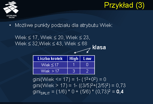Rozpoczniemy od analizy pierwszego możliwego punktu podziału, Wiek <= 17. Zauważmy, że ten punkt podziału dzieli nam zbiór treningowy S na dwie partycje. Warunek Wiek <= 17 spełnia tylko jedna krotka, która należy do klasy Ryzyko = High. Pozostałe krotki należą do partycji S2 czyli spełniają warunek Wiek > 17. Takich krotek w zbiorze treningowym jest 5, z których trzy należą do klasy Ryzyko = High oraz dwie należą do klasy Ryzyko = Low. Obliczamy wartość indeksu Gini dla partycji pierwszej, czyli takiej, która spełnia predykat Wiek <= 17. Wartość ta wynosi 0. Następnie obliczamy wartość indeksu Gini dla drugiej partycji (Wiek>17). Wartość indeksu Gini wynosi 0.73. W oparciu o te wartości możemy następnie obliczyć wartość indeksu podziału Gini Split, który dla tego punktu podziału wynosi 0.4.