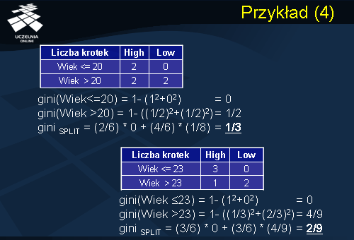 Rozważmy kolejny punkt podziału dla atrybutu Wiek. Jest nim punkt podziału Wiek<=20. Punkt podziału dzieli zbiór treningowy na partycje składająca się z dwóch rekordów. Oba rekordy należą do klasy Ryzyko = High. Partycja druga (Wiek>20), składa się z 4 rekordów, z których 2 rekordy należą do klasy Ryzyko = High i 2 rekordy należą do klasy Ryzyko = Low. Wartość indeksu Gini dla partycji pierwszej wynosi 0 – partycja czysta. Wartość indeksu Gini dla drugiej partycji, która jest równomiernie rozłożona pomiędzy klasy High i Low wynosi 1. Wartość indeksu podziału GiniSplit wynosi 1/3. Kolejny punkt podziału dla atrybutu Wiek to punkt podziału Wiek <= 23. Ten punkt podziału dzieli zbiór danych treningowych na partycje S1 składającą się z trzech rekordów. Wszystkie trzy rekordy należą do klasy Ryzyko = High. Natomiast partycja druga składa się również z trzech rekordów, jeden rekord należy do klasy Ryzyko = High oraz dwa rekordy Ryzyko = Low. Wartość indeksu Gini dla klasy pierwszej wynosi 0, czyli mamy klasę czystą (wszystkie rekordy należą do tej samej klasy). Wartość indeksu Gini dla drugiej partycji wynosi 4/9. Indeks podziału Gini wynosi 2/9.