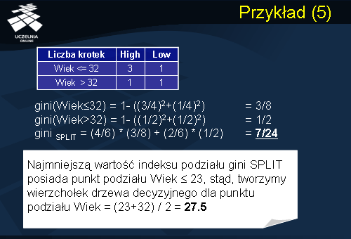 Rozważmy kolejny punkt podziału dla atrybutu Wiek, Wiek<=32. Ten punkt podziału dzieli zbiór treningowy na dwie partycje. Pierwsza partycja składa się z czterech rekordów, trzy z nich należą do klasy Ryzyko = High, oraz jeden do klasy Ryzyko = Low. Druga partycja zawiera dwa rekordy, po jednym z każdej klasy. Wartość indeksu Gini dla pierwszej partycji wynosi 3/8. Wartość indeksu Gini dla drugiej partycji wynosi 1. Wartość indeksu podziału GiniSplit wynosi 7/24. Pomińmy w naszych rozważaniach pozostałe punkty podziału. Z dotychczas rozważanych punktów podziału najmniejszą wartość indeksu podziału GiniSplit posiada punkt podziału Wiek<=23. Załóżmy również, że wartości indeksu podziału dla wszystkich punktów podziału dla deskryptora Typ_samochodu są większe aniżeli wartości indeksu dla punktów podziału dla atrybutu Wiek. Ponieważ najmniejszą wartość indeksu podziału GiniSplit posiada punkt podziału Wiek<=23 stąd tworzymy wierzchołek drzewa decyzyjnego. Jak ma wyglądać test dla takiego wierzchołka?. Atrybut Wiek jest atrybutem numerycznym, zatem test będzie wyglądał w następujący sposób: ‘Wiek <= ?’. Pojawia się pytanie czy ? Ma przyjąć wartość punktu podziału czyli wartość 23 czy też inną. Zastanówmy się nad następującym przypadkiem: Mamy nowego kierowcę w wieku 24 lat. Czy kierowca będzie się zachowywał jak kierowca 23 letni, dla którego ryzyko wypadku jest wysokie, czy też będzie się zachowywał jak kierowca 32 letni, dla którego ryzyko wypadku jest niskie. Odwróćmy sytuacje, mamy nowy przypadek: kierowca mający lat 31, czy kierowca będzie się zachowywał jak kierowca 32 letni, czy też jak kierowca 23 letni. Zauważmy, że pomiędzy wartościami 23 i 32 następuje punkt przecięcia. Stąd też tworzymy wierzchołek drzewa decyzyjnego dla punktu podziału, w którym wartość testu jest równa wartości (23 (przechowywana w bazie)+32(gdzie następuje zmiana przynależności do klasy))/2. Zatem punktem podziału, który będzie związany z nowym wierzchołkiem drzewa decyzyjnego będzie 27.5.