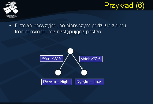 Po pierwszym podziale zbioru treningowego drzewo decyzyjne ma następującą postać przedstawioną na slajdzie. Korzeniem drzewa jest wierzchołek związany z punktem podziału Wiek<=27.5, z którego wychodzą dwie gałęzie. Pierwsza gałąź reprezentuje podział wiekowy <=27.5, druga gałąź reprezentuje rekordy dla których wartość atrybutu Wiek>27.5. Gałęzie te łączą wierzchołek korzenia z dwoma wierzchołkami, z którymi związane są dwie partycje. Do pierwszej partycji S1 należą wszystkie rekordy, dla których atrybut Wiek spełnia warunek Wiek<=27.5. Zauważmy, że pierwsza partycja S1 jest partycją „czystą”, w tym sensie, że wszystkie rekordy należące do tej partycji należą do jednej klasy. Wywołanie procedury Partition dla partycji S1, spowoduje zatrzymanie podziału i utworzenie wierzchołka liścia oraz związanie z tym wierzchołkiem etykiety Ryzyko = High. Natomiast druga partycja jest partycją, która nie jest czysta. Zawiera dwa rekordy, które należą do klasy Ryzyko = Low oraz jeden rekord należący do klasy Ryzyko = High. Jeżeli warunek stopu jest zdefiniowany w ten sposób, że liczba rekordów, które muszą należeć do danej partycji > 3, wówczas następuje zatrzymanie działania procedury Partition, utworzenie wierzchołka liścia i przydzielenie temu wierzchołkowi etykiety klasy, która dominuje w danym zbiorze partycji. Wówczas utworzony zostałby wierzchołek, który byłby wierzchołkiem liściem, którego wartość etykiety (klasy) byłaby równa Low.