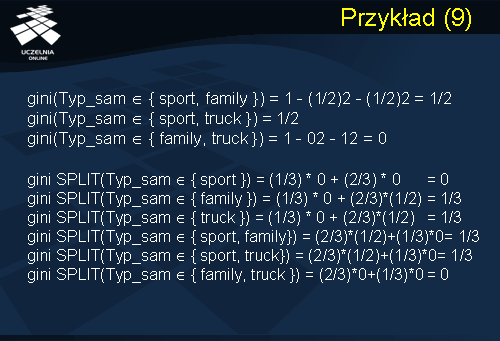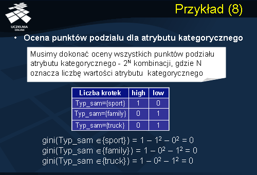 Musimy zatem dokonać oceny wszystkich możliwych punktów podziału dla atrybutu Typ_samochodu. Przypomnijmy, że atrybut Typ_samochodu jest atrybutem kategorycznym. Postać testu stanowiącego punkt podziału, dla atrybutu kategorycznego A ma następująca postać wartość A należy do X, gdzie X jest podzbiorem dom(A). Dziedzina wartości naszego atrybutu kategorycznego Typ_samochodu składa się z trzech elementów, samochód sport, samochód family oraz samochód truck. Liczba wszystkich możliwych punktów podziału atrybutu kategorycznego wynosi 2^N kombinacji, gdzie N oznacza liczbę wartości atrybutu kategorycznego. W naszym przypadku N wynosi 3, stąd liczba wszystkich możliwych punktów podziału wynosi 8. Zauważmy, że z punktu widzenia operacji zawierania się punkty podziału tworzą kratę, z której powinniśmy usunąć element minimalny i maksymalny ponieważ nie wnoszą one żadnego punktu podziału. Stąd też ostatecznie liczba punktów podziału, dla których należy dokonać oceny jakości punktu podziału wynosi 2^N-2.