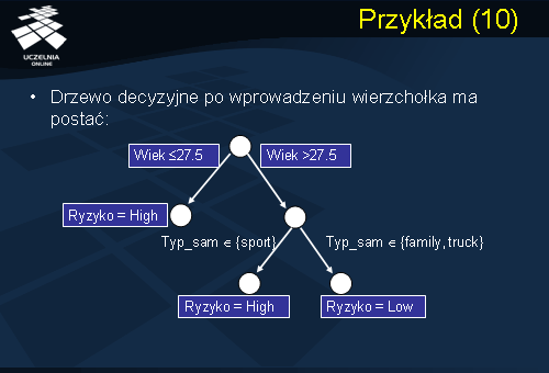 Jak już powiedzieliśmy najmniejszą wartość indeksu podziału Gini posiada punkt podziału Typ_sam należy do kategorii {sport}. Tworzymy wierzchołek wewnętrzny w drzewie decyzyjnym dla tego punktu podziału. Punkt podziału Typ_sam należy do kategorii {sport} dzieli zbiór krotek związanych z tym wierzchołkiem na dwie partycje. Pierwsza partycja składa się z jednego rekordu, która spełnia ten predykat i który należy do klasy Ryzyko = High. Druga partycja składa się z dwóch rekordów należących do klasy Ryzyko = Low. Ponieważ obie partycje są „czyste” kończy to konstrukcję drzewa decyzyjnego. Drzewo decyzyjne po wprowadzeniu wierzchołka wewnętrznego będzie miało postać przedstawioną na slajdzie.