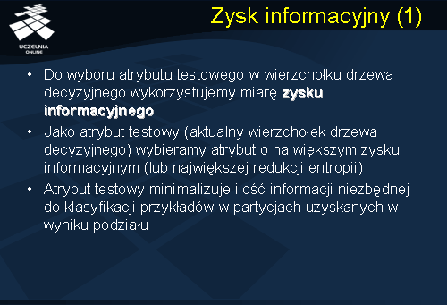 Inną popularną grupą algorytmów indukcji drzew decyzyjnych są algorytmy, które do oceny punktu podziału wykorzystują kryterium zysku informacyjnego. Do tej grupy algorytmów należą takie popularne algorytmy jak algorytm ID3 oraz algorytm C 4.5. W algorytmach tych punktem podziału jest cały atrybut. Problem konstrukcji drzewa decyzyjnego przy użyciu miary zysku informacyjnego może być przedstawiony następująco. Najpierw zostaje wybrany atrybut, który jest korzeniem drzewa decyzyjnego. Dla każdej wartości wybranego atrybutu tworzona jest gałąź w tym drzewie decyzyjnym, z którą będzie związany zbiór rekordów posiadający tą samą wartość wybranego atrybutu. Następnie proces partycjonowania jest powtarzany dla każdej partycji związanej z każdą gałęzią. Jeżeli wszystkie rekordy podanego węzła należą do tej samej klasy, proces partycjonowania jest zakończony, dalszy podział węzłów jest niepotrzebny. Jeżeli nie, wówczas proces partycjonowania zbioru rekordów związany z daną gałęzią jest kontynuowany. W jaki sposób wybieramy atrybut związany z punktem podziału. Taki atrybut będziemy nazywać atrybutem testowym. Jako atrybut testowy (aktualny wierzchołek drzewa decyzyjnego) wybieramy atrybut o największym zysku informacyjnym (lub największej redukcji entropii). Z teorii informacji okazuje się, że atrybut który gwarantuje największy zysk informacyjny jest to atrybut, który który minimalizuje ilość informacji niezbędnej do klasyfikacji przykładów w partycjach uzyskanych w wyniku podziału.