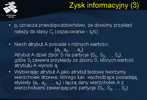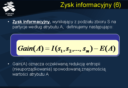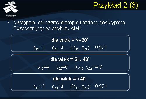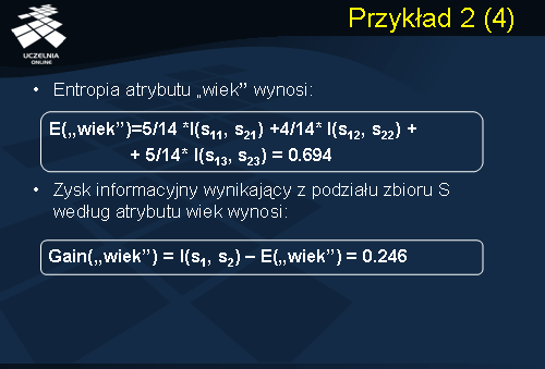 Entropia podziału zbioru S na partycje wg atrybutu A zgodnie ze wzorem ze slajdu 21 wynosi 0.694. Zauważmy, że wagi wyrażeń I we wzorze na entropię są równe: 5/14 ponieważ partycja S1 składa się z 5 rekordów natomiast cały zbiór treningowy zawiera 14 rekordów, 4/14 – partycja S2 składa się z 4 rekordów i partycja S3 składa się z 5 rekordów. Zysk informacyjny wynikający z podziału zbioru S wg atrybutu wiek wynosi 0.246 i jest równy różnicy wartości oczekiwanej ilości informacji niezbędnej do zaklasyfikowania dowolnego przykładu ze zbioru S minus entropia atrybutu Wiek.