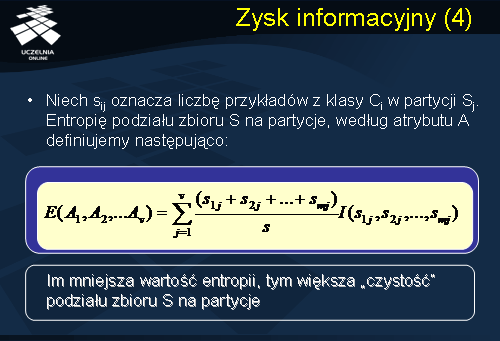 Niech sij oznacza liczbę przykładów z klasy Ci w partycji Sj. Entropię podziału zbioru S na partycje, według atrybutu A definiujemy wzorem przedstawionym na slajdzie. Można łatwo zauważyć, że entropia jest miarą nieuporządkowania zbioru S zgodnie z atrybutem A. Im mniejsza wartość entropii tym większa „czystość” podziału zbioru S na partycje, tzn. uzyskane w wyniku podziału partycje będą tym czystsze im mniejsza jest wartość entropii.