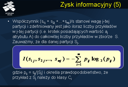Współczynnik (s1j + s2j +...+smj)/s stanowi wagę j-tej partycji i zdefiniowany jest jako iloraz liczby przykładów w j-tej partycji (i.e. krotek posiadających wartość aj atrybutu A) do całkowitej liczby przykładów w zbiorze S. Zauważmy, że dla danej partycji Sj, wyrażenie I(s1j + s2j +...+ smj) podane wzorem przedstawionym na slajdzie, definiuje nam oczekiwaną ilość informacji niezbędną do zaklasyfikowania danego przykładu w partycji sj do określonej klasy. Jak łatwo zauważyć oczekiwana ilość informacji niezbędna do zaklasyfikowania danego przykładu jest równa 0 jeżeli cała partycja jest czysta, czyli należy do jednej klasy. W przeciwnym razie wartość tego wyrażenia określa nam nieuporządkowanie (nieczystość) partycji sj.
