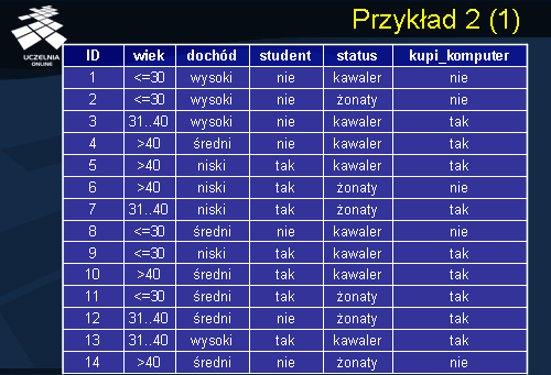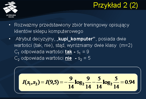 Rozważany przez nas zbiór treningowy S składa się z 14 przykładów. Atrybut decyzyjny, „kupi_komputer”, posiada dwie wartości (tak, nie), stąd, wyróżniamy dwie klasy. Klasa C1 odpowiada wartości „tak”, natomiast klasa C2 odpowiada wartości „nie”. S1 – liczba przykładów zbioru S należących do C1 i wynosi 9. S2 - liczba przykładów należących do klasy C2 wynosi 5. Podstawiając do wzoru na oczekiwanej ilości informacji niezbędnych do zaklasyfikowania danego przykładu należącego do zbioru S , wynosi 0.94.