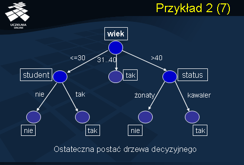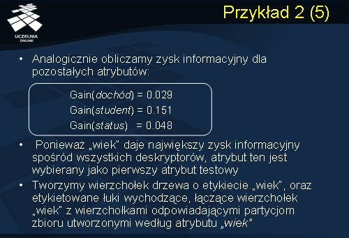 W analogiczny sposób obliczamy zysk informacyjny dla pozostałych atrybutów dochód, student oraz status. Ponieważ Wiek daje największy zysk informacyjny spośród wszystkich deskryptorów, atrybut ten jest wybierany jako pierwszy atrybut testowy. Tworzymy wierzchołek drzewa o etykiecie Wiek, oraz etykietowane łuki wychodzące łączące wierzchołek Wiek z wierzchołkami odpowiadającymi partycjom S1,S2 oraz S3 utworzonymi zgodnie z podziałem zbioru S wg atrybutu Wiek.