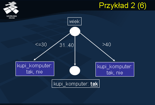 W ten sposób otrzymujemy drzewo decyzyjne przedstawione na slajdzie, które zawiera korzeń związany z atrybutem testowym wiek, charakteryzującym się największym zyskiem informacyjnym oraz trzy gałęzie wychodzące etykietowane wartościami atrybutu Wiek<=30 , 31..40 oraz >40. Gałęzie te łączą korzeń z wierzchołkami reprezentującymi partycje S1, S2 i S3. Zauważmy, że partycja S2 jest partycją czystą, czyli zawiera rekordy należące do tej samej klasy kupi_komputer = tak. Przekształcamy zatem ten wierzchołek liścia, który etykietujemy wartością klasy kupi_komputer = tak. Dla pozostałych partycji S1 i S3 kontynuujemy proces partycjonowania i tworzenia drzewa decyzyjnego.