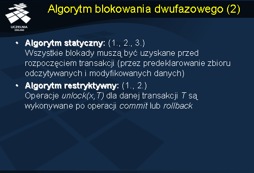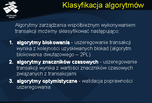 algorytmy blokowania - uszeregowanie transakcji wynika z kolejności uzyskiwanych blokad (algorytm blokowania dwufazowego – 2PL);