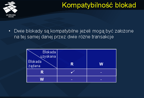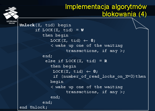 Niniejszy slajd przedstawia algorytm odblokowania danej X przez transakcję tid. Jeżeli dana X była blokowana w trybie do zapisu (W) przez transakcję tid, wówczas, następuje zdjęcie blokady do zapisu (dana X jest niezablokowana) i dostęp do danej X uzyskuje pierwsza transakcja z kolejki transakcji oczekujących na dostęp do danej X. Jeżeli dana X była blokowana w trybie do odczytu (R) przez transakcję tid, wówczas następuje zdjęcie blokady do odczytu dla tej transakcji. Jeżeli transakcja tid była jedyną transakcją blokującą daną X do odczytu, wówczas, po zdjęciu blokady przez transakcję tid, dana X znajdzie się w stanie – nie zablokowana. Jeżeli natomiast, równolegle z transakcją tid dana X była blokowana do odczytu przez inne transakcje, wówczas, po zdjęciu blokady przez transakcję tid, dana X znajdzie się w stanie - zablokowana do odczytu.