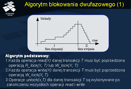 Jak widać z poprzedniego przykładu stosowanie blokad na danych nie gwarantuje automatycznie uszeregowalności realizacji zbioru transakcji. Okazuje się, że istotna jest kolejność zakładania i zdejmowania blokad. Ilustruje to podstawowy algorytm blokowania, nazywany algorytmem blokowania dwu-fazowego (2PL). Podstawowa wersja algorytmu 2PL ma następującą postać: