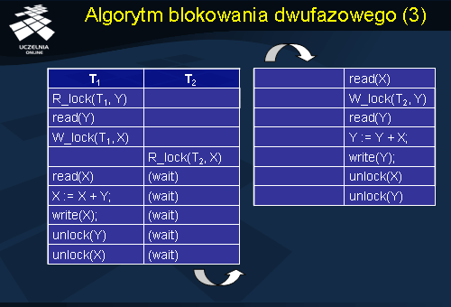 Końcowy stan bazy danych uzyskany w wyniku przedstawionego współbieżnego wykonania transakcji T1 i T2 wynosi tym razem X=50 i Y=80. Zauważmy, że tym razem stan końcowy bazy danych jest równoważny stanowi bazy danych uzyskanemu w wyniku sekwencyjnej realizacji transakcji T1 i T2. Oznacza to, że przedstawiona realizacja współbieżna transakcji jest uszeregowalna.