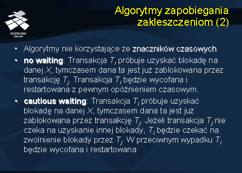 no waiting : Transakcja Ti próbuje uzyskać blokadę na danej X , tymczasem dana ta jest już zablokowana przez transakcję Tj . Transakcja Ti będzie wycofana i restartowana z pewnym opóźnieniem czasowym.