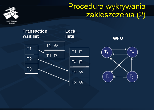 Przykładowo, na grafie FWG przedstawionym na slajdzie transakcja T1 oczekuje na zwolnienie danej Y blokowanej przez transakcję T2. Transakcja T2 oczekuje na uwolnienie danej Z blokowanej przez transakcję T3, która, z kolei oczekuje na zwolnienie danej X blokowanej przez transakcję T1.