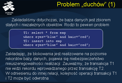 Przedstawimy obecnie problem duchów, który jest konsekwencją przyjęcia określonej jednostki blokowania. Zakładaliśmy dotychczas, że baza danych jest zbiorem stałych i niezależnych obiektów. Rodzi to pewien problem.