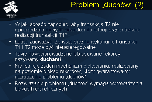 W jaki sposób zapobiec, aby transakcja T2 nie wprowadzała „duchów” do relacji emp w trakcie realizacji transakcji T1? Jak pokazaliśmy na poprzednim slajdzie pojawienie się rekordów duchów może prowadzić do nieuszeregowalności transakcji. Okazuje się, że nie istnieje żaden mechanizm blokowania, realizowany na poziomie blokad rekordów, który gwarantowałby rozwiązanie problemu „duchów”. Rozwiązanie problemu „duchów” wymaga wprowadzenia blokad hierarchicznych.