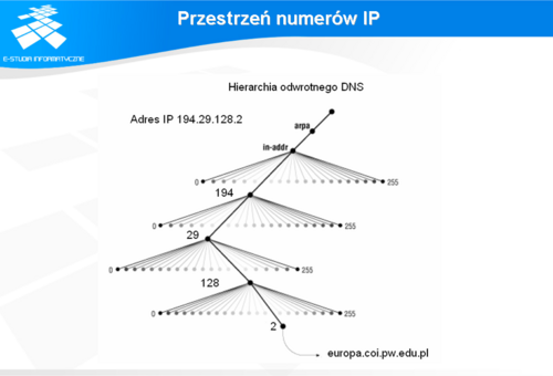 Program ten wywołany bez opcji uruchamia się w trybie interakcyjnym wypisując parametry domyślnego serwera DNS. Polecenie „set” służy do konfiguracji zakresu odpowiedzi. W przykładzie ze slajdu ustawiono wartość opcji „querytype” (w skrócie „q”) na „any”, co oznacza, że program w odpowiedzi na postawione zapytanie wyświetli wszystkie informacje, które będzie w stanie uzyskać o danym obiekcie. Zakres odpowiedzi można ograniczyć do wybranych elementów. Szczegóły można znaleźć w manualu do polecenia nslookup (man nslookup). W wyniku zapytania o nazwę hosta rose.ee.pw.edu.pl, program wyświetlił parametry serwera, który udzielił odpowiedzi, parametry adresowe hosta oraz parametry adresowe serwerów DNS obsługujących domenę do której należy host. Z programu wychodzimy poleceniem „exit”.