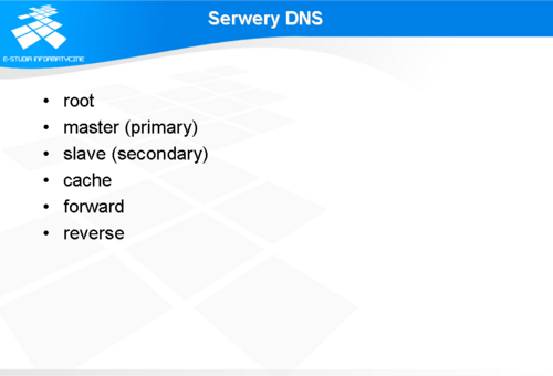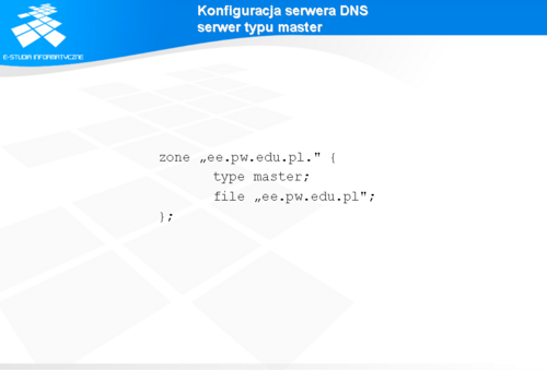 W celu skonfigurowania serwera DNS jako master serwera dla konkretnej domeny, należy do pliku named.conf dodać odpowiednią deklarację typu „zone”, zawierającą opcję „type master” oraz opcję określającą nazwę pliku z bazą danych dla domeny. Deklaracja „zone” może zawierać dodatkowo inne dodatkowe opcje podnoszące funkcjonalność lub zwiększające bezpieczeństwo systemu. Szczegółowy opis opcji dodatkowych można znaleźć w dokumentacji do systemu BIND. Opis pliku z bazą danych dla domeny zostanie przedstawiony na kolejnych slajdach.
