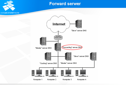 Ponadto zgodnie z wpisami w pliku named.conf należy w katalogu /var/named albo innym, w zależności od wartości deklaracji „directory” bloku „options” umieścić pliki wymienione w blokach „zone”. Po uruchomieniu, serwery będą samodzielnie wysyłały zapytania do Internetu. Na tym etapie, w konfiguracji serwerów wewnętrznych można dodać w bloku „options” deklarację: „forwarders { <ip serwera zewnętrznego>; };”, w której należy podać numer IP serwera zewnętrznego, znajdującego się w strefie DMZ danego oddziału. W wyniku tego zabiegu, wszystkie zapytania generowane przez serwery wewnętrzne powinny być obsługiwane przez serwery znajdujące się w strefie DMZ.