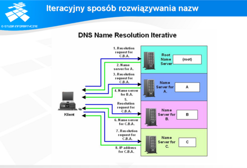 Na przykład, jeżeli trzeba rozwiązać nazwę www.pw.edu.pl klient wysyła zapytanie rekurencyjne do serwera DNS, którego adres znajduje się w plikach konfiguracyjnych systemu operacyjnego. Serwer DNS sprawdza, czy w buforze znajduje się informacja dotycząca tej nazwy. Jeżeli tak, to zwraca do klienta odpowiedź. Jeżeli nie ma takiej nazwy w bazie albo w buforze, to sprawdza, czy master wie jaki serwer obsługuje domenę pw.edu.pl, potem domenę edu.pl i na końcu pl. Jeżeli serwer nie ma takiej informacji w buforze, to wysyła zapytanie do jednego z serwerów głównych typu root. W odpowiedzi otrzyma informację w postaci adresu serwera DNS obsługującego domenę pl, do którego wyśle zapytanie. Serwer obsługujący domenę pl w odpowiedzi prześle adres serwera obsługującego domenę edu.pl, do którego nasz serwer wyśle kolejne zapytanie i od którego otrzyma adres serwera DNS obsługującego domenę pw.edu.pl, który z kolei, jak należy się spodziewać w odpowiedzi zwróci adres IP odpowiadający nazwie www.pw.edu.pl. Przedstawiony przykład opisuje skrajny przypadek, gdy żaden z serwerów DNS nie wie nic więcej poza adresem serwera domeny podrzędnej wchodzącej w skład nazwy. W praktyce, jeżeli jakiś serwer będzie miał w buforze szukany adres albo adres serwera obsługującego domenę tworzącą nazwę lub jej fragment, to zwróci tę informację przez co znacznie skróci proces poszukiwania rozwiązania. Oczywiście serwer DNS poszukując odpowiedzi gromadzi w buforze wszystkie otrzymane odpowiedzi przez ściśle określony czas. Jeżeli w tym czasie otrzyma zapytanie dotyczące, np. nazwy www.ee.pw.edu.pl, to rozpocznie przeszukiwanie od serwera obsługującego domenę pw.edu.pl. Natomiast poszukując rozwiązania dla nazwy www.fuw.edu.pl skieruje pierwsze zapytanie do serwera obsługującego domenę edu.pl.