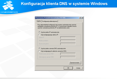 Następnie należy wpisać odpowiednie deklaracje do pliku resolv.conf, który także na ogół znajduje się w katalogu /etc. W pliku tym powinna znajdować co najmniej jedna deklaracja „nameserver”, wskazująca adres IP serwera DNS. Serwer ten będzie każdorazowo pytany przez aplikacje uruchomione w danym systemie operacyjnym podczas poszukiwania rozwiązań dla nazw. W deklaracji tej możemy podać dowolny serwer w Internecie, jednak zazwyczaj podawany jest adres serwera właściwego dla danego segmentu sieci, ze względu na szybkość odpowiedzi, ale przede wszystkim, ze względu na fakt, że ten inny serwer może odmówić udzielenia odpowiedzi. Jeżeli na danym hoście uruchomiony jest serwer DNS, to jako adres IP serwera DNS podaje się numer IP: 127.0.0.1. Zgodnie z normami w pliku resolv.conf może znajdować się nie więcej niż 3 deklaracje typu „nameserver”. W pliku tym można zadeklarować domyślną nazwę domeny za pomocą deklaracji „domain”, co spowoduje, że do każdej nazwy nie zakończonej kropką automatycznie będzie dołączany zadeklarowany ciąg znaków. Jeżeli dana organizacja składa się z wielu jednostek posiadających własne domeny, lub komputery tej organizacji w zdecydowanej większości przypadków kontaktują się z nieliczną grupą ściśle określonych domen, to zamiast deklaracji „domain” można użyć deklaracji „search” z listą nazw domen. Podczas poszukiwania odpowiedzi nazwy domen podanych w opcji „search” będą dołączane według kolejności w liście do nazwy poszukiwanej, o ile ta nie kończy się znakiem kropki. Proces poszukiwań kończy się w chwili znalezienia pierwszej, poprawnej odpowiedzi.