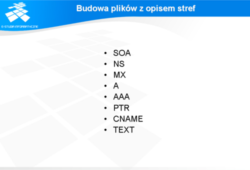 Najważniejszym rekordem w bazie jest rekord SOA (ang. Start Of Authority), który zgodnie ze swoją rolą zawsze znajduje się jako pierwszy. Wszystkie rekordy rozpoczynają się nazwą opisywanego obiektu, deklaracją typu sieci, deklaracją typu rekordu. Po tych deklaracjach umieszczana jest wartość rekordu, która może mieć postać złożoną (rekordy typu SOA i MX). Ponieważ w praktyce dominującym typem sieci jest Internet, oznaczany symbolem IN, normy dopuszczają traktowanie tego oznaczenia jako domyślne i pomijanie w opisie rekordu. Istotną zasadą budowy rekordu jest możliwość pominięcia nazwy obiektu w kolejnym rekordzie dotyczącym tego obiektu. Fakt ten należy wyraźnie zaznaczyć zapisując pozostałe parametry rekordu z zachowaniem wolnej przestrzeni na początku rekordu. Na następnych slajdach zostaną przedstawione podstawowe i najczęściej spotykane sposoby użycia rekordów. Szczegółowych opisów należy szukać w dokumentacji serwerów DNS.