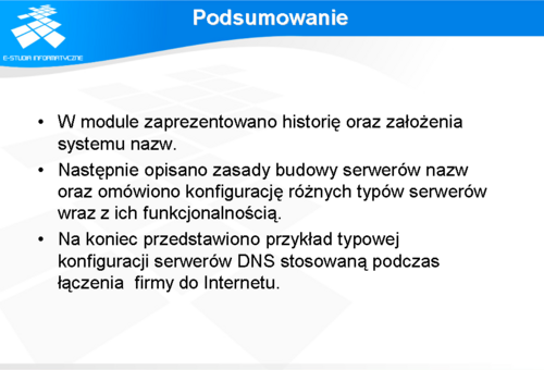 poprawność uruchamiania programu serwera (ps –ef, /var/adm/messages), komunikaty w pliku z logami (/var/name/log), poprawność mapowania z wewnątrz i z zewnątrz sieci (nslookup, dig, itp..).