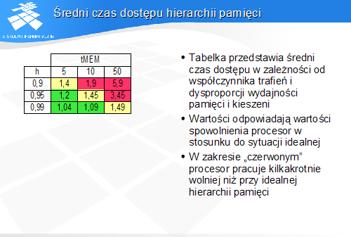 Tabelka przedstawia średni czas dostępu w zależności od współczynnika trafień i dysproporcji wydajności pamięci i kieszeni