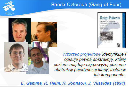 Autorami pierwszej szeroko znanej publikacji poświęconej wzorcom w inżynierii oprogramowania byli E. Gamma, R. Helm, R.Johnson i J. Vlissides, znani jako Banda Czterech (Gang of Four) – w bliżej niesprecyzowanym nawiązaniu do nazwy grupy dawnych prominentów w komunistycznych Chinach. W swojej książce opisali 24 wzorce projektowe dotyczące konstrukcji, struktury i zachowania obiektów w systemach informatycznych. Ich zdaniem, poziom abstrakcji wzorca projektowego powinien znajdować się powyżej poziomu pojedynczej klasy.
