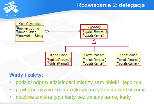 Pierwsze, niemal intuicyjne rozwiązanie polega na utworzeniu podklas reprezentujących rodzaje kart. Podklasy dziedziczą wspólne atrybuty i zachowanie po nadklasie stanowiącej ogólną Kartę Czytelnika, definiując jednak własny sposób wykonania niektórych metod (np. opłataRoczna () i opłataKarna ()). Z punktu widzenia zachowania programu jest to zatem rozwiązanie poprawne, które jednocześnie promuje ponowne użycie kodu poprzez wykorzystanie dziedziczenia.