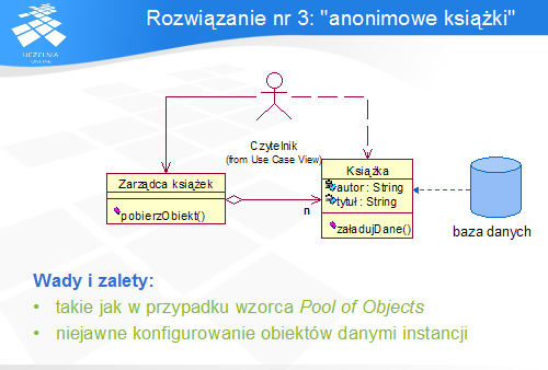 Na tym slajdzie przedstawiono inny mechanizm – "anonimowych książek", stanowiący rozwinięcie wzorca Puli obiektów. Pula przechowywała nierozróżnialne obiekty gotowe do użycia, zatem niemożliwe było przechowywanie w nich informacji specyficznej. Natomiast w przypadku obiektów anonimowych pula zawiera obiekty "nieaktywne", pozbawione specyficznych danych, wymagające inicjacji przed przekazaniem Klientowi. Polega ona właśnie na załadowaniu do obiektu informacji specyficznych, np. odczytanych z bazy danych. W ten sposób klient otrzymuje dokładnie taki obiekt, jakiego oczekuje, nie powodując zwiększenia zużycia zasobów.