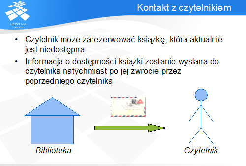 Rozwiązanie to znane jest jako wzorzec o nazwach Observer lub Listener. Biblioteka pełni rolę Podmiotu – obiektu, którego stan jest obserwowany, natomiast Czytelnik jest jego Obserwatorem. Czytelnik wyraża zainteresowanie powiadomieniami, rejestrując się Bibliotece jako Obserwator. W efekcie Biblioteka wywołuje wspólną metodę wszystkich Obserwatorów (aktualizuj ()) na rzecz każdego zarejestrowanego Obserwatora.