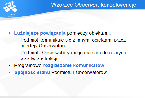 Jednym z najważniejszych konsekwencji zastosowania wzorca Observer jest ograniczenie powiązań i zależności pomiędzy obserwatorami i obiektem obserwowanym. Wprawdzie obiekt obserwowany posiada referencje do obserwatorów, jednak jego wiedza jest ograniczona tylko do znajomości interfejsu Obserwator, który deklaruje jedną metodę. Także Obserwatory nie muszą znać Podmiotu w momencie wywołania ich metody aktualizuj (), ponieważ otrzymują powiadomienia asynchroniczne.