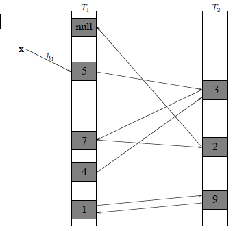 Implementacja operacji Lookup jest w tym momencie jasna. Podobnie Delete(\(x\)), usuwa \(x\) z \(T_1[h_1(x)]\) lub \(T_2[h_2(x)]\). Jest oczywiste, że obie te operacje działają w pesymistycznym czasie stałym. W dalszej części zajmujemy się operacją Insert.