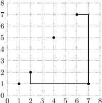 Wyjaśnienie do przykładu: Kapitan może wyznaczyć trasę, którą zaznaczono na obrazku. W trakcie rejsu z wyspy 1 (współrzędne (2, 2)) na wyspę 4 (współrzędne (7, 1)) kapitan steruje tylko przez godzinę, gdy statek płynie na południe. W trakcie drugiego fragmentu podróży kapitan steruje jedynie wtedy, gdy statek porusza się na wschód.